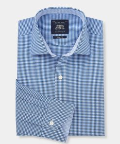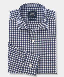 Savile Row Men’s Navy Cotton Gingham Check Classic Fit Formal Shirt – Single Cuff | Navy