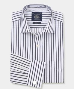 Savile Row Men’s Navy White Stripe Cotton Classic Fit Formal Shirt – Double Cuff | Navy