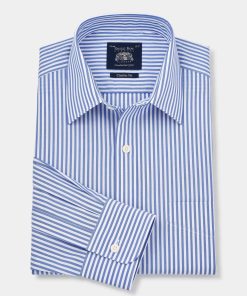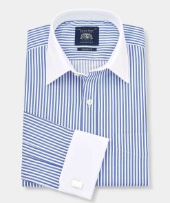 Savile Row Men’s Blue Bengal Stripe Windsor Collar Classic Fit Formal Shirt – Double Cuff | Blue