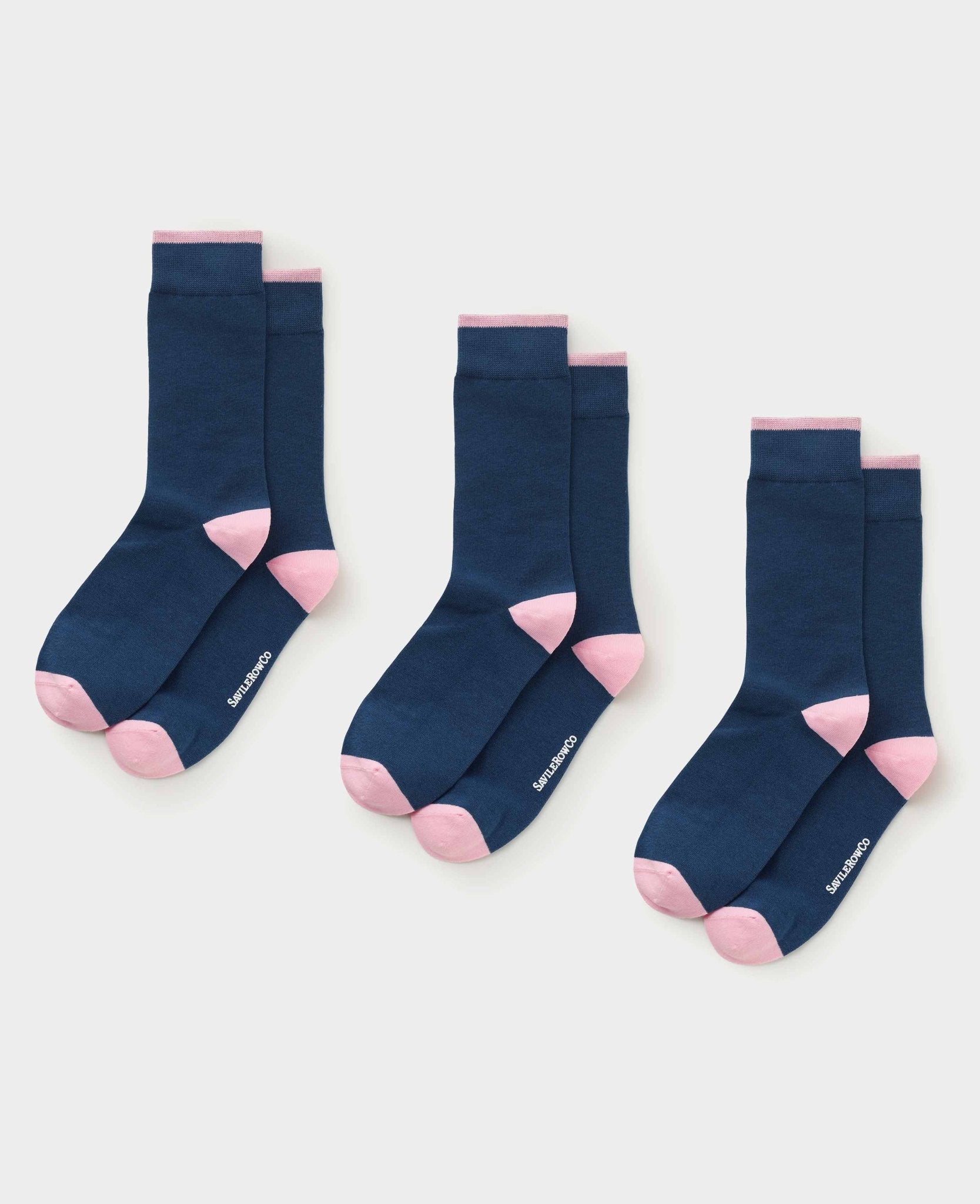Our blue men’s socks combine comfort and style in a perfect everyday essential. Made from a soft, stretchy cotton-blend fabric, these socks offer a snug, breathable fit that ensures all-day comfort. The ribbed tops help keep them securely in place, while the durable construction makes them ideal for regular use. The standout feature is the pink contrast heel, toe and tipping at the top of the rib, adding a fun and stylish pop of colour to your wardrobe.