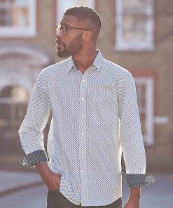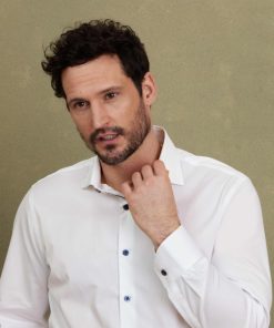 - Contrast inside neck placket, cross stitching on button placket, crest embroidery and herringbone in side slit