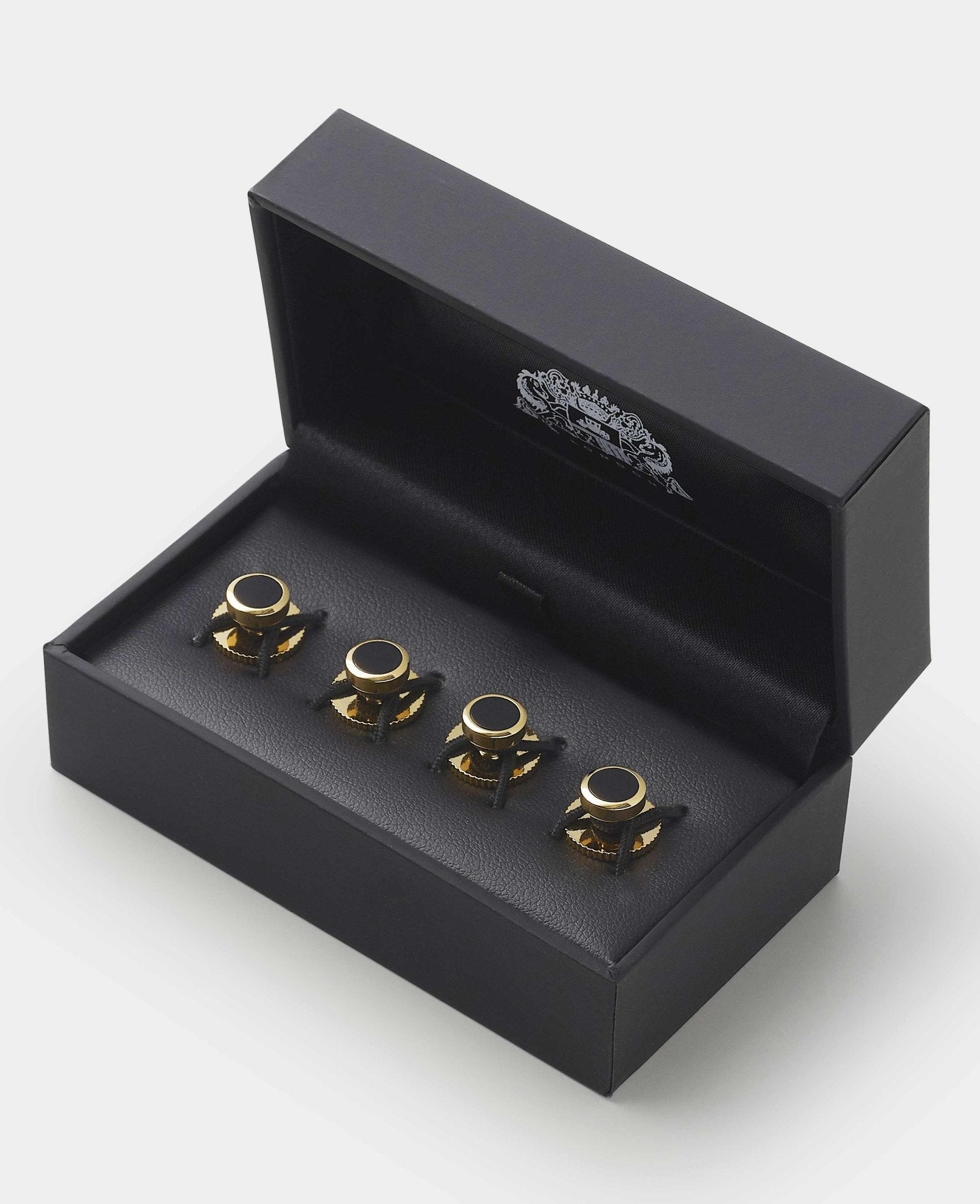 Complete your formal ensemble with our black onyx stone dress studs, the perfect finishing touch for black tie events and elegant occasions. Designed to be worn with dress shirts, these four studs feature striking black onyx stones set in brass with a sophisticated gold tone plating, adding subtle yet refined detail to your look. Presented in a classic Savile Row box, they make an exceptional gift or a stylish addition to your own wardrobe. Pair them effortlessly with our Marcella Bib front dress shirt for a timeless, polished appearance.