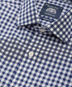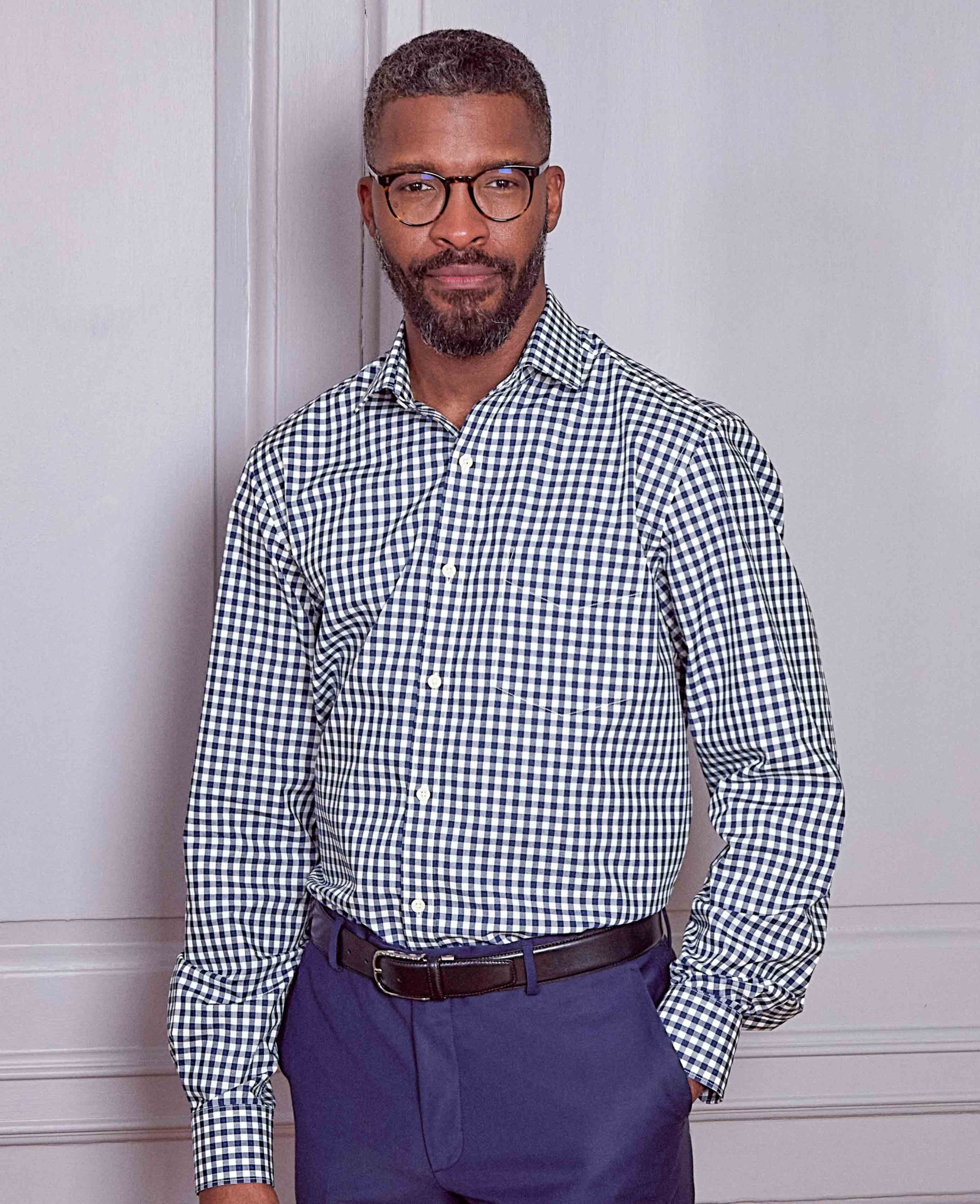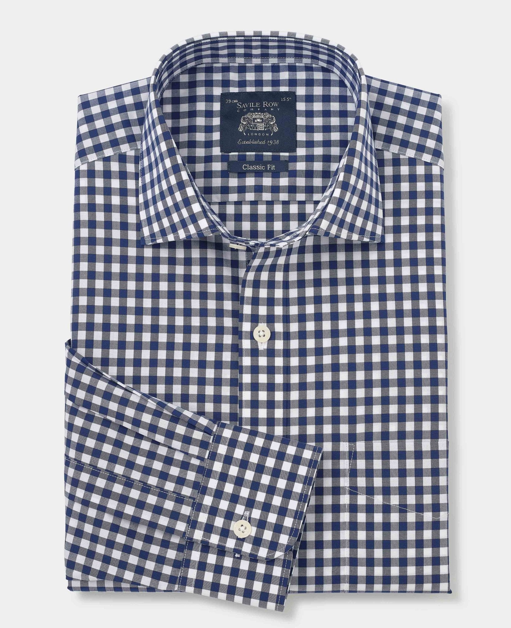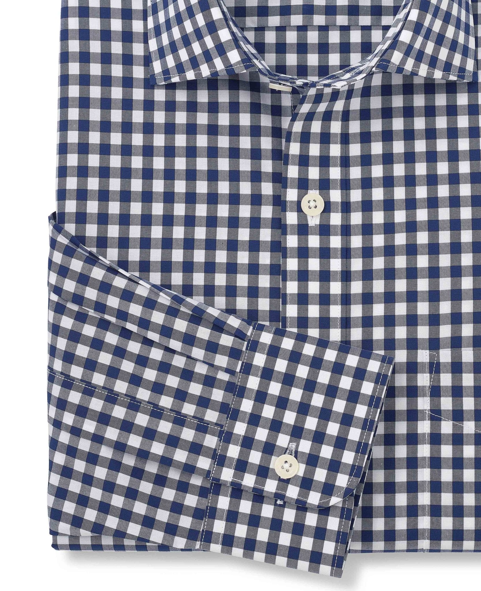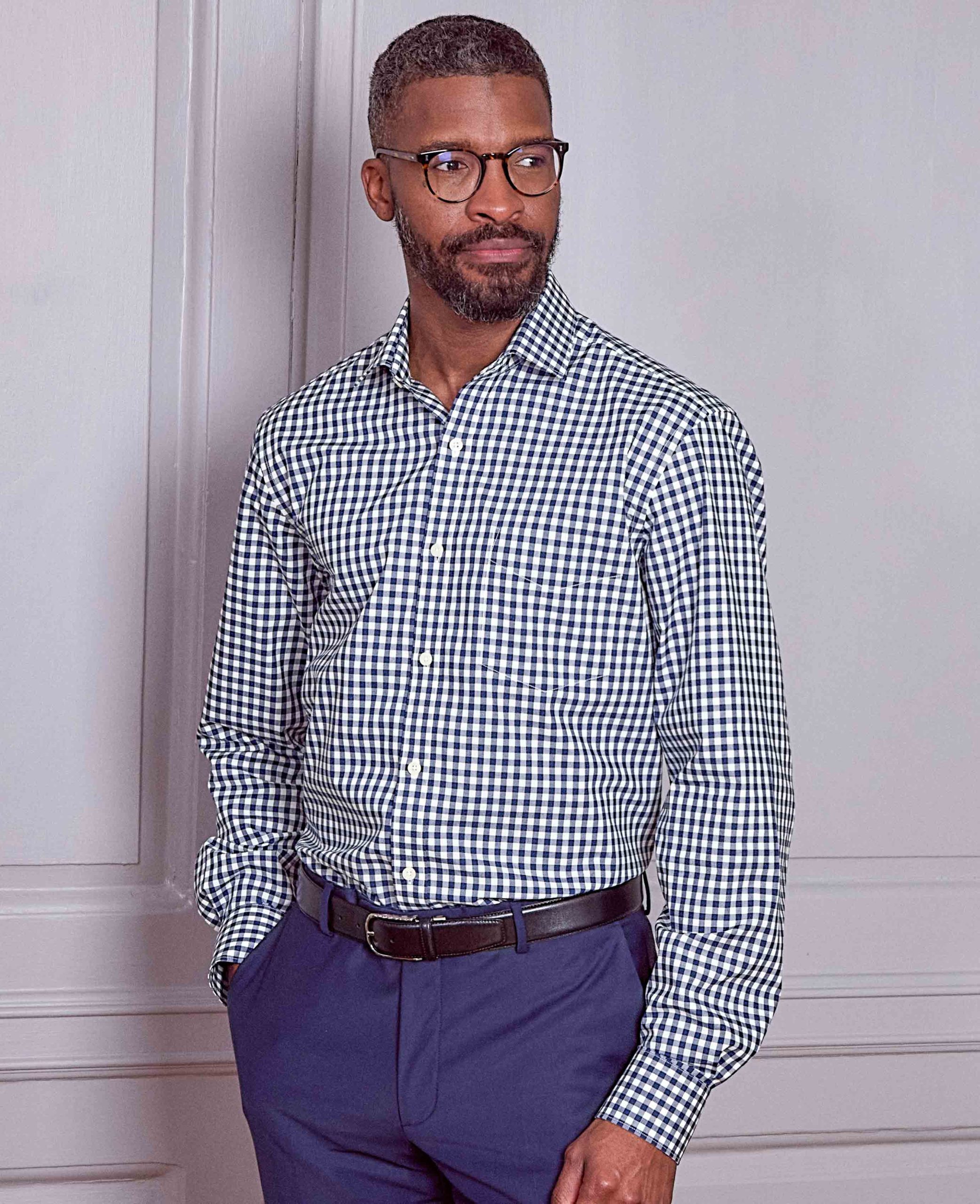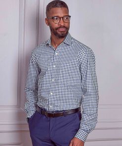 This navy gingham formal shirt is a timeless addition to your wardrobe, offering both style and practicality. Made from premium poplin cotton, it’s lightweight, breathable and smooth, ensuring all-day comfort. The check pattern adds charm, while the single cuffs keep it classic. Designed with an easy iron-finish, this men’s shirt maintains a crisp, polished look with minimal effort.