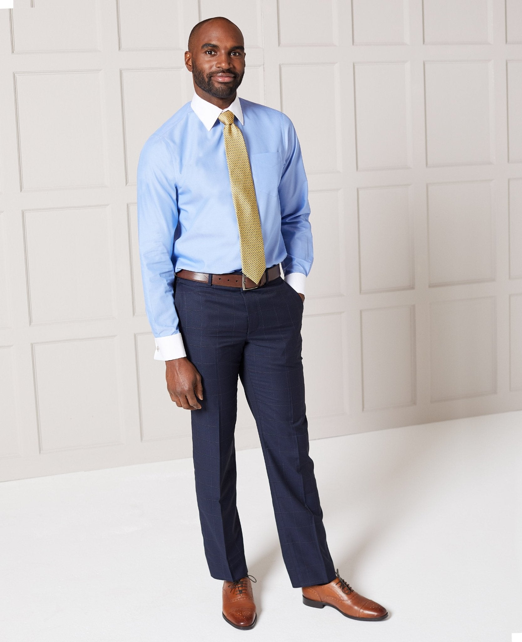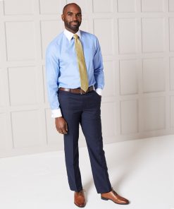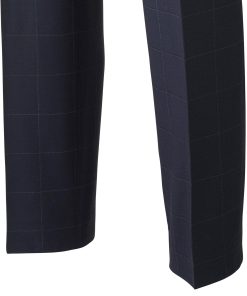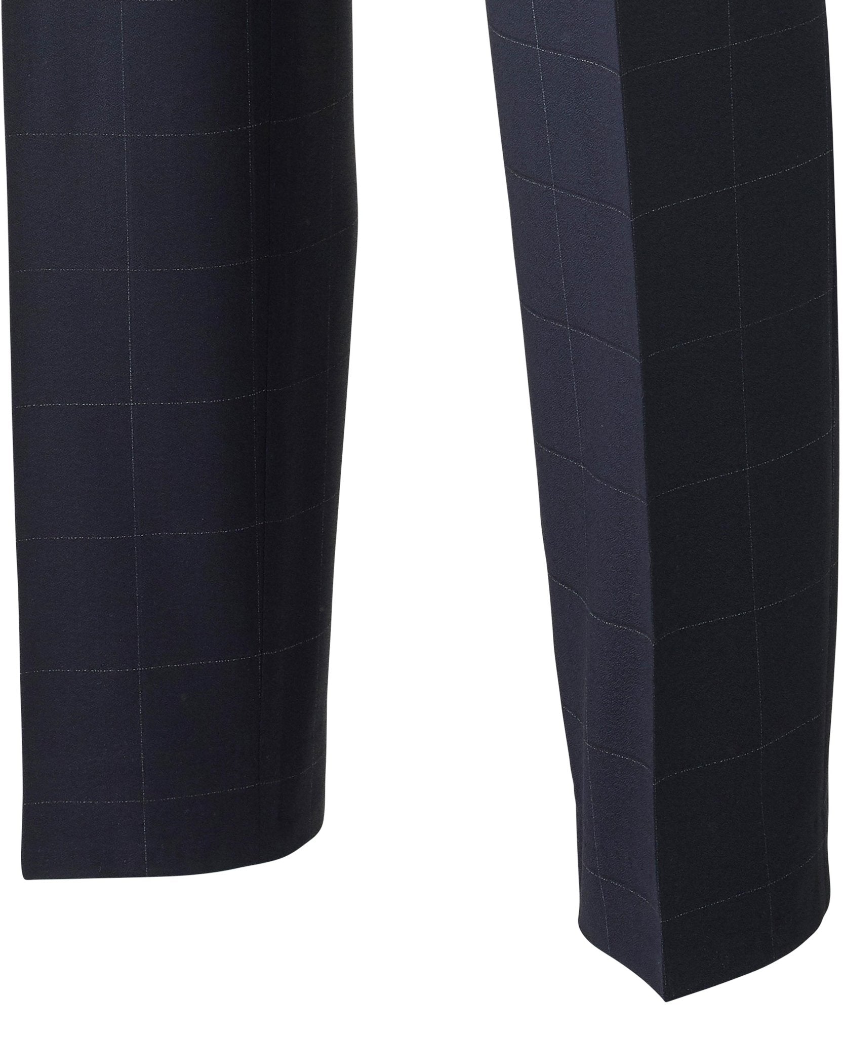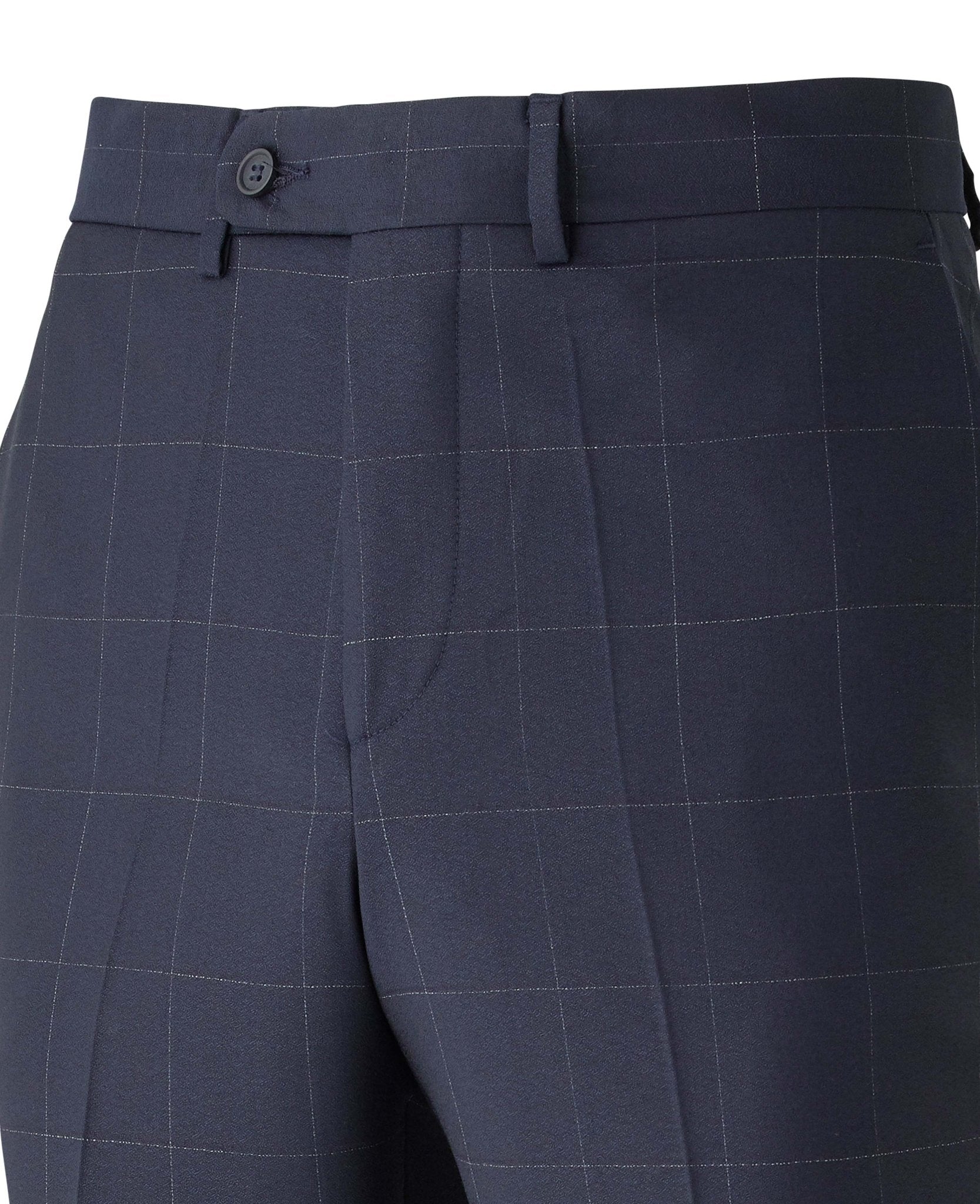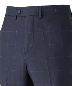 Navy suit trousers decorated with a fine windowpane check. Flat front design in a tailored fit. Featuring a subtle birdseye texture.