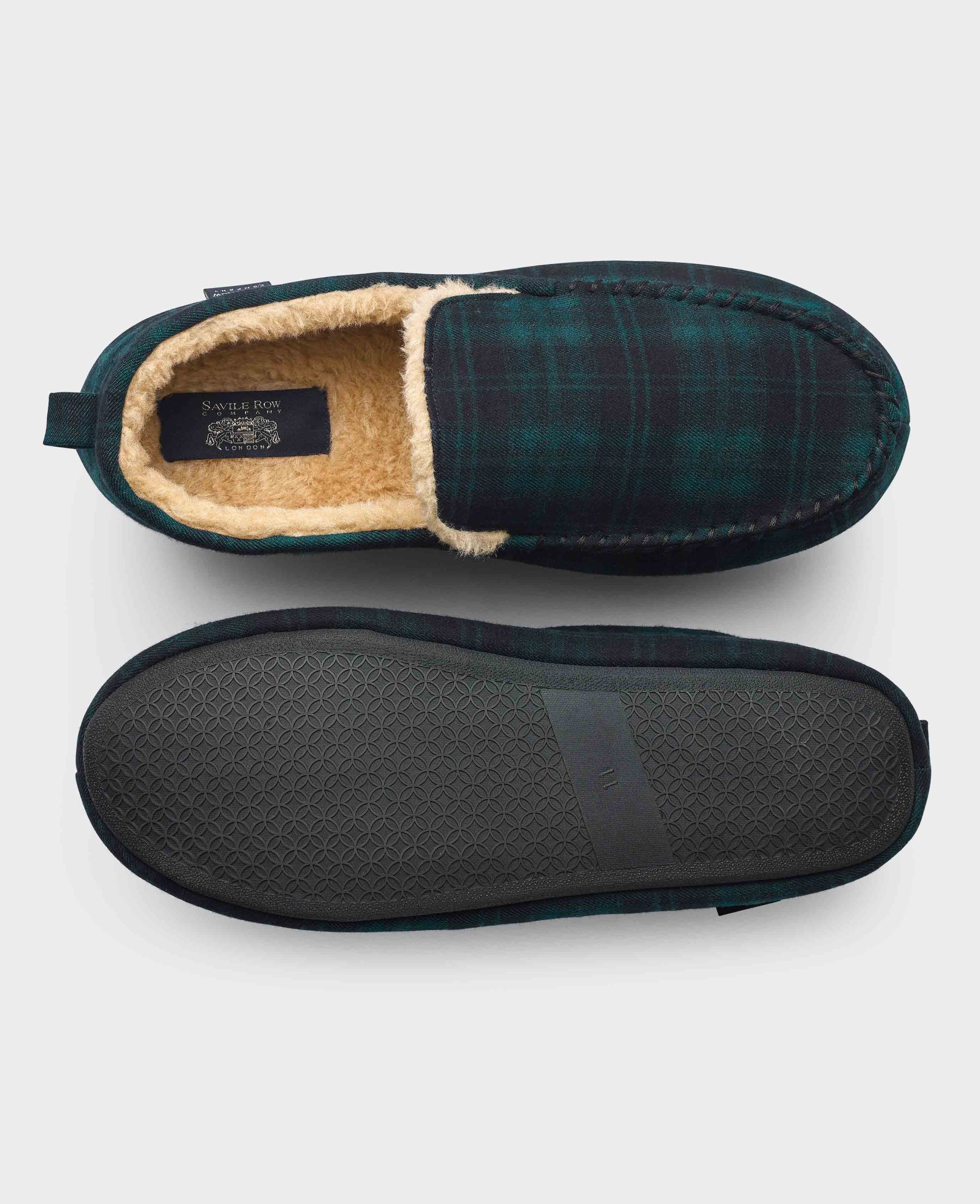 Add a touch of timeless style and unbeatable comfort to any man’s nightwear collection with our black and green check moccasins slippers. Crafted with a soft beige faux fur lining, they provide a cosy, warm embrace that’s perfect for chilly winter evenings. The classic check outer fabric will impress the postman, while the moccasin design and handy pull tab make them easy to slip on and off. Finished with a lightweight rubber sole for quiet, confident steps around the house, these slippers combine practicality with plush comfort.