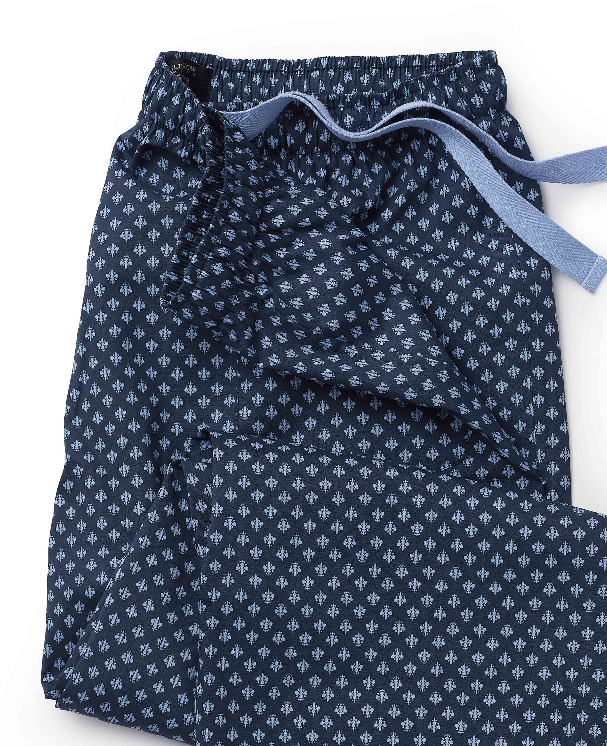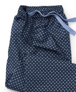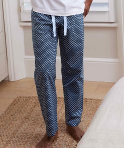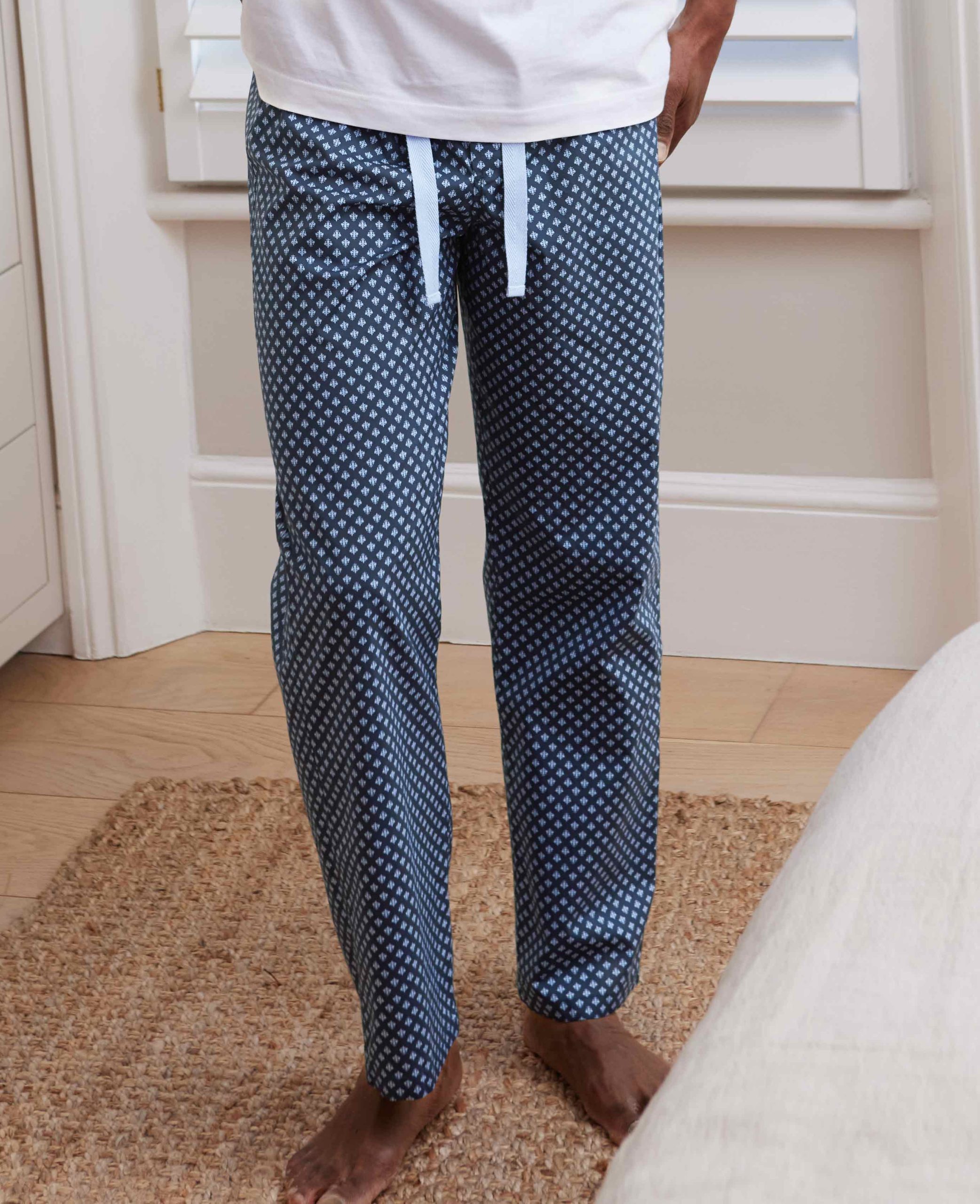 Unwind in style with our men’s blue printed lounge pants, where classic design meets everyday comfort. Whether you’re enjoying a slow morning, winding down after a long day or slipping into sleep, these bottoms are designed to keep you feeling cool and at ease. Crafted from 100% pure cotton poplin, the fabric is lightweight, breathable and wonderfully soft against the skin. The fully elasticated waistband, finished with a contrast herringbone drawstring, ensures a flexible, comfortable fit, while the buttoned working fly adds a touch of everyday practicality. A single back pocket, embroidered with our signature logo, completes the refined yet laid-back look.