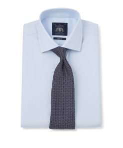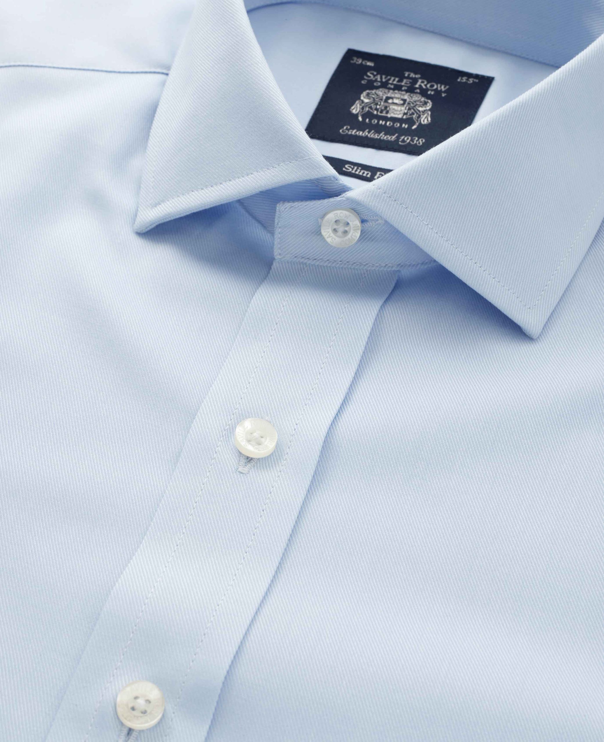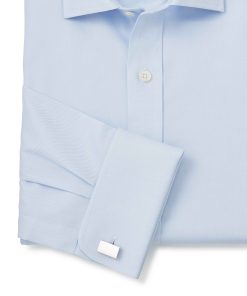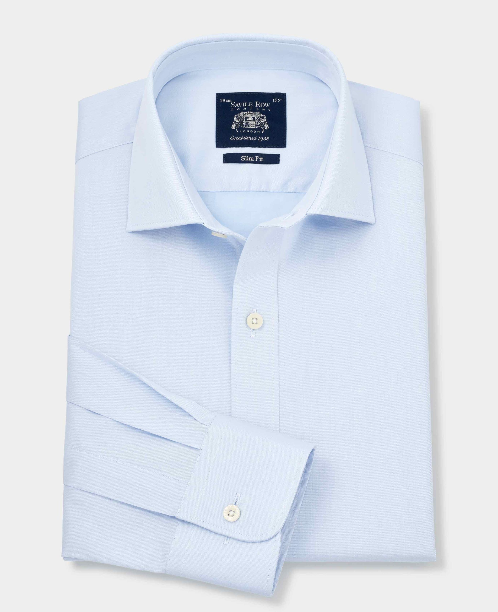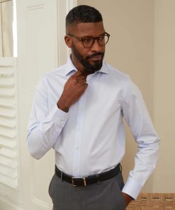 Crafted from 100% BCI cotton woven with a fine twill structure, this sky blue formal shirt has been cut to a slim fit that’ll tuck neatly into your choice of trousers. A must-have for any wardrobe, it comes complete with a crisp cutaway collar and is available with single or double cuffs.