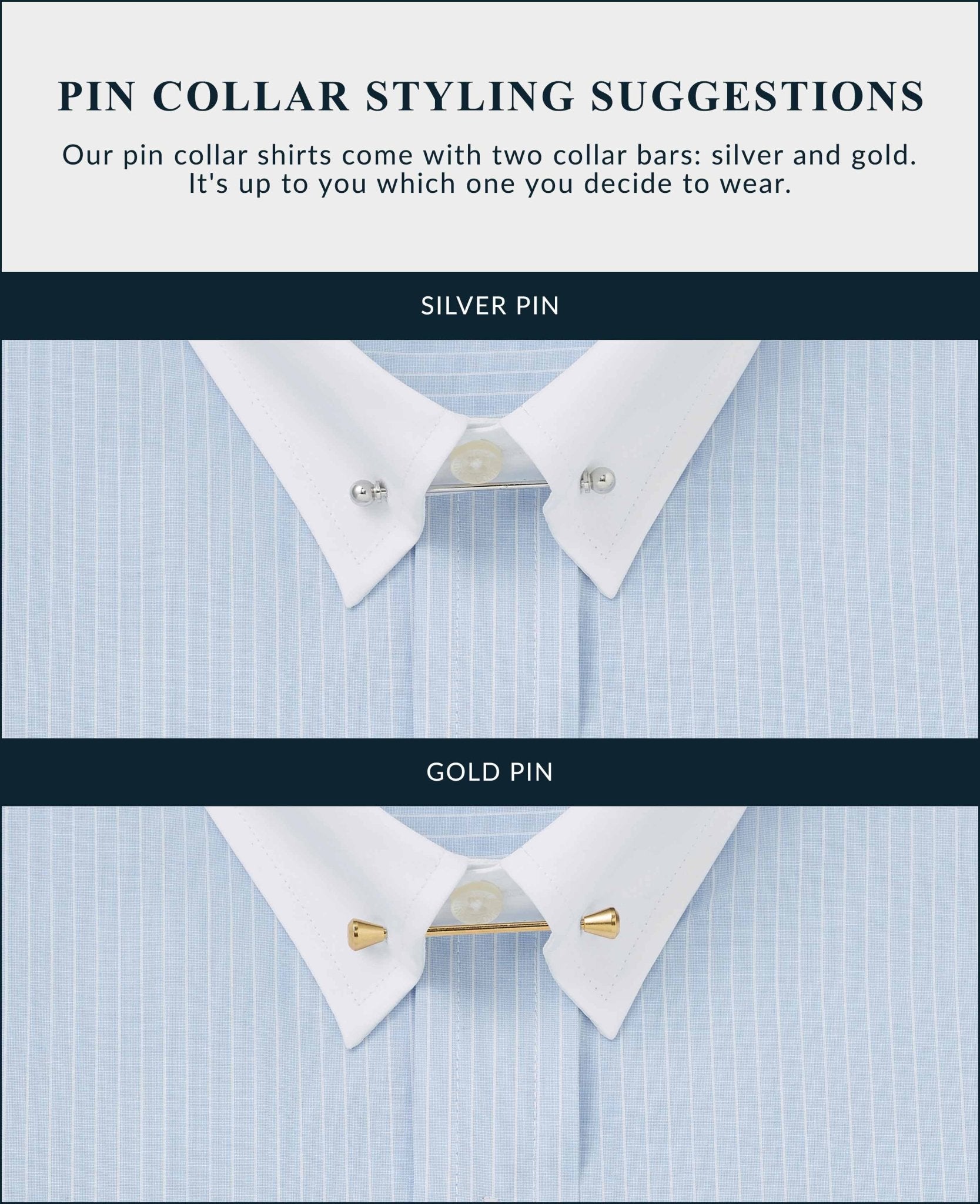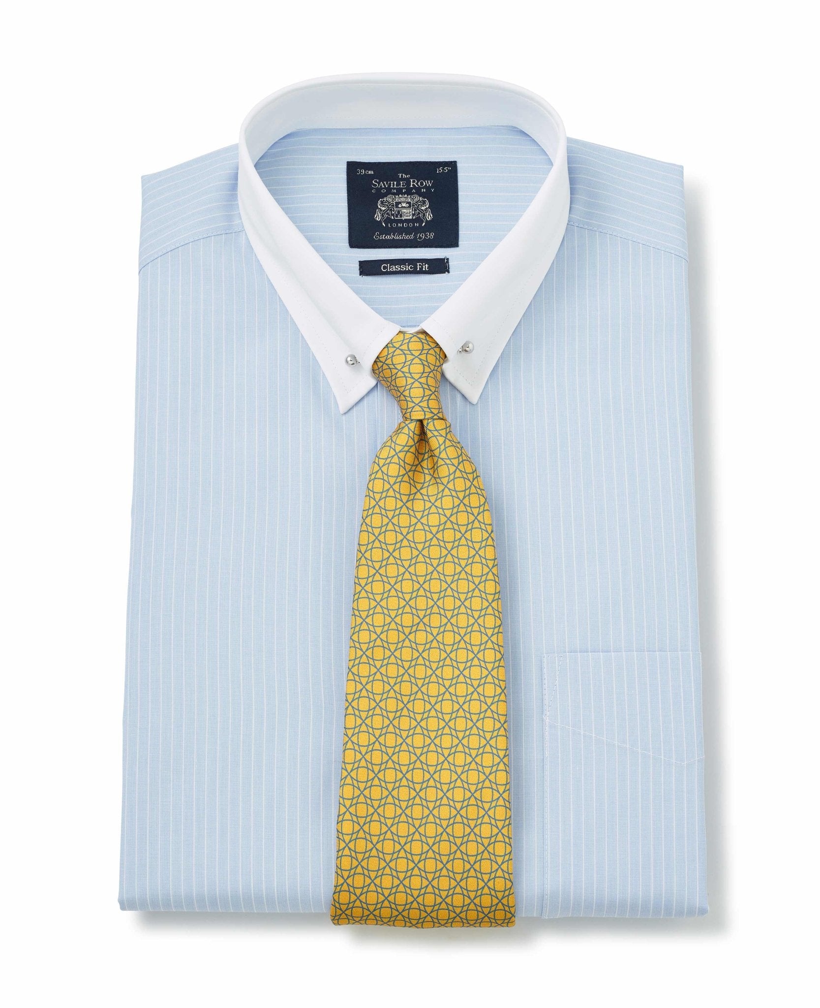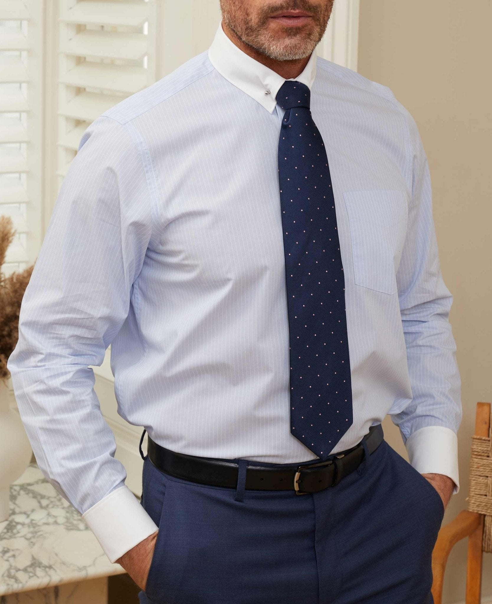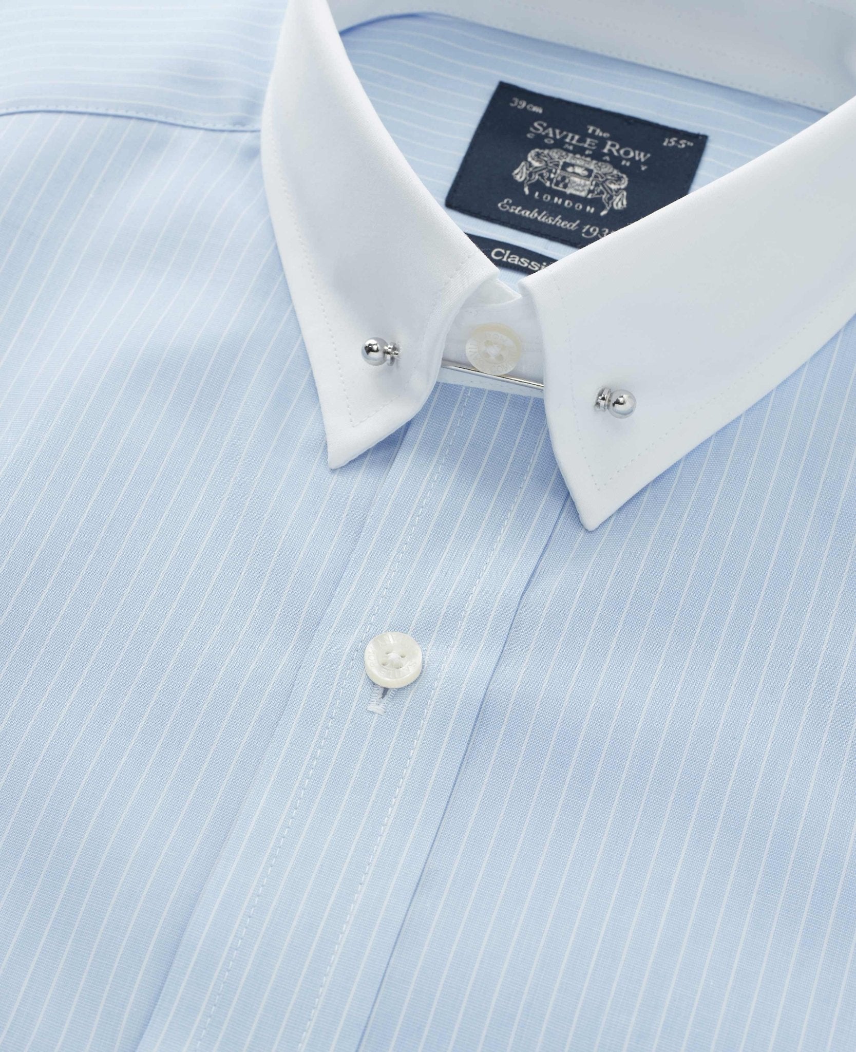 Our popular pin collar shirt, now in a refined sky blue and white stripe design, is a true sartorial statement. The pin collar – a distinguished detail, lifts and holds the tie knot in place, creating a sharp, elevated look that exudes sophistication. Traditionally worn for formal occasions, it’s the perfect choice for weddings, business events or whenever you want to make an impression. Cut in a generously proportioned classic fit with a contrast collar and cuffs, it offers both comfort and timeless elegance. Plus, we include both gold and silver-tone collar bars, so you can tailor your look to suit your style.