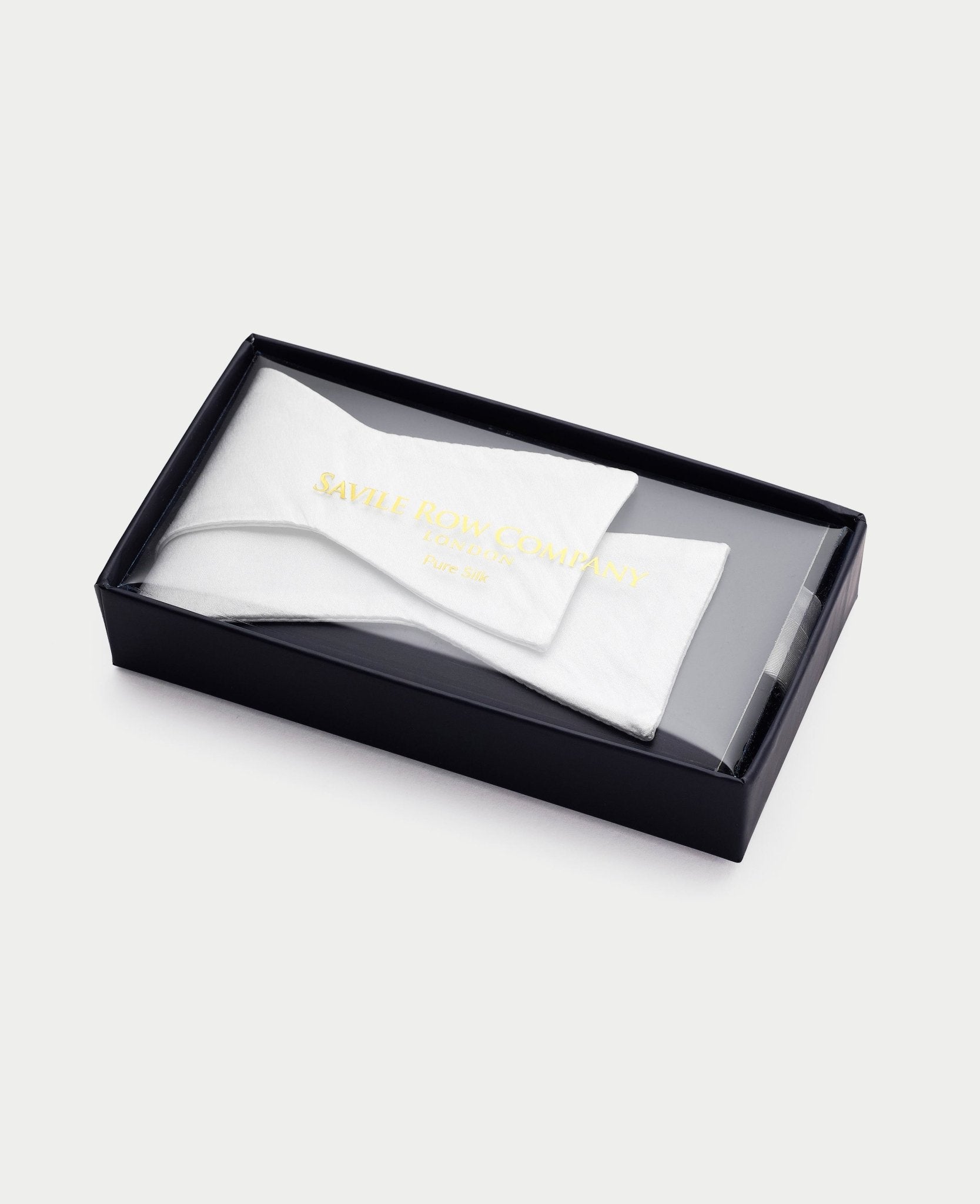 An essential for any white-tie event, this men’s white silk bow tie is the perfect finishing touch to your black dinner suit. The set will arrive in a special Savile Row box, so it also makes an excellent gift idea for him.