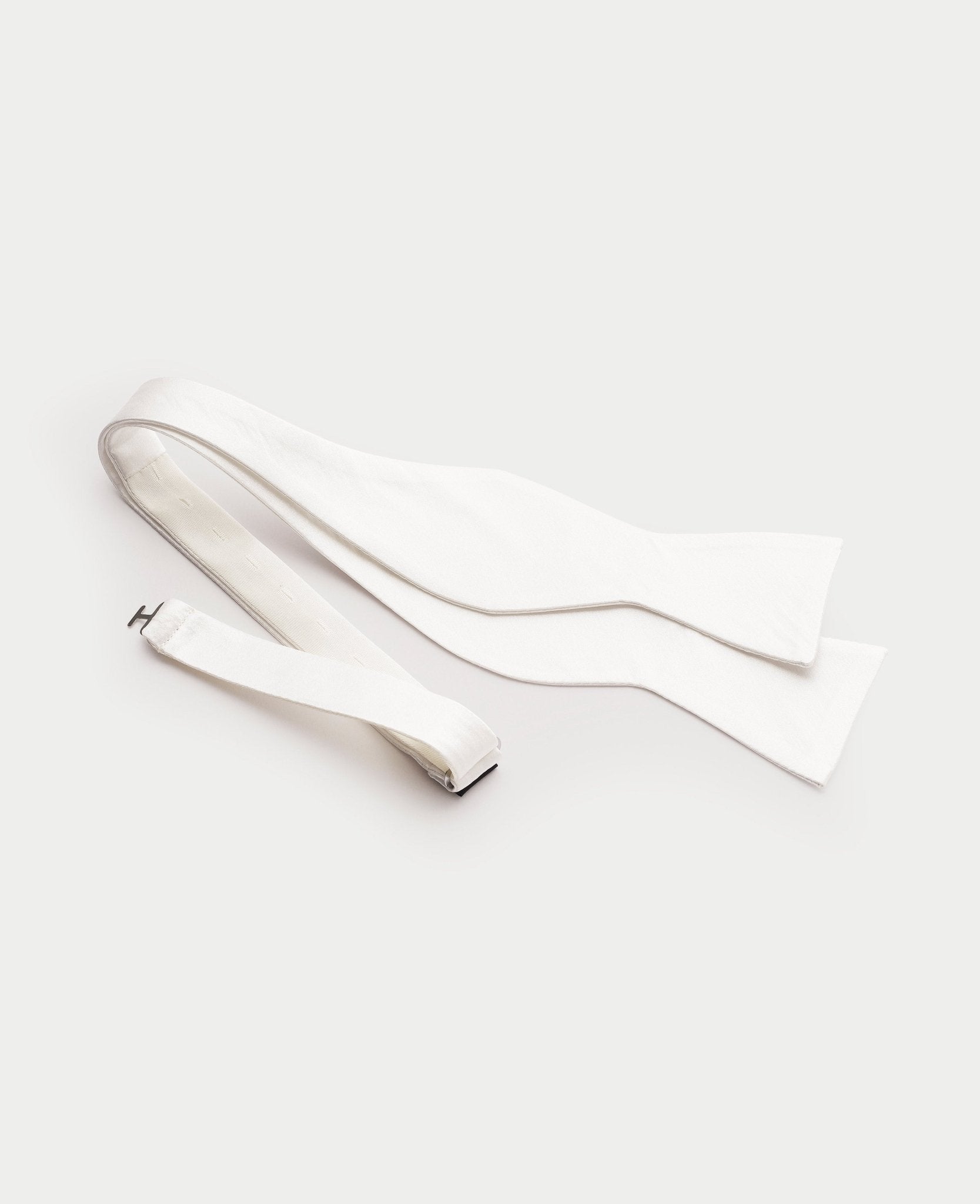 - Self bow tie in white silk satin interlined with fine wool for perfect body and shape